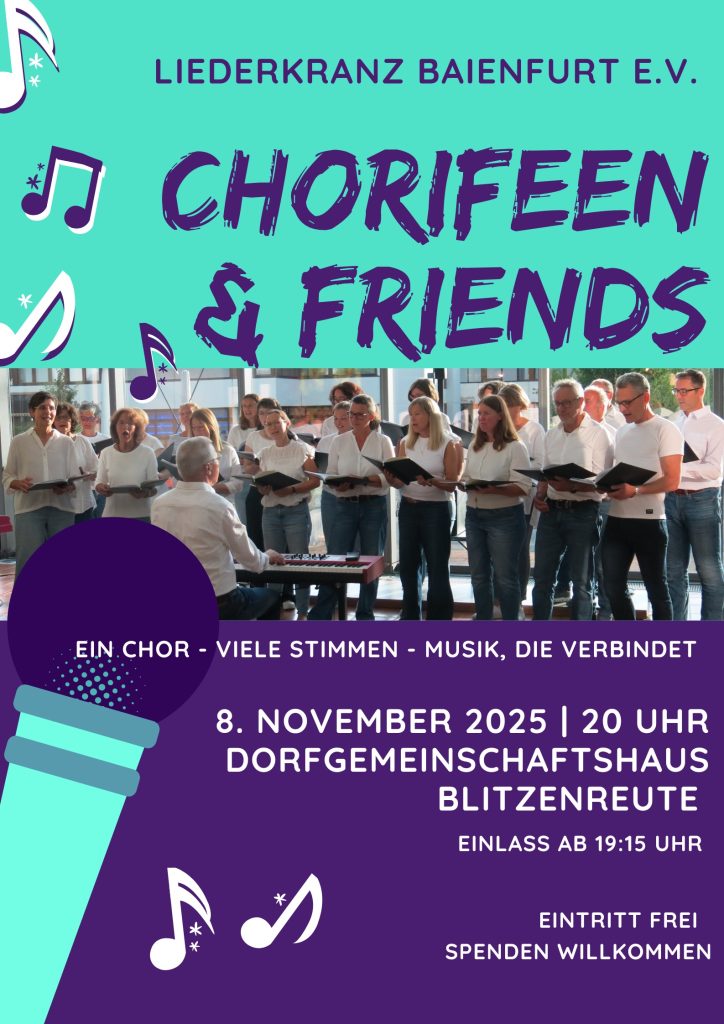 Am 08. Juli 2025, 19:30 Uhr heißt es Bühne frei für die Chorifeen & Friends des Liederkranzes Baienfurt! Im Rahmen des Marktplatzkonzertes erwartet Sie ein lebendiges Konzert mit einem abwechslungsreichen Mix – von mitreißenden Sixties-Hits, einem schwungvollen ABBA-Medley bis hin zu Coldplay. Freuen Sie sich auf einen Abend voller Musik, Vielfalt und Lebensfreude – kommen Sie vorbei und genießen Sie den Sommer mit uns! Bei schlechtem Wetter findet das Konzert im Foyer des Rathauses statt.